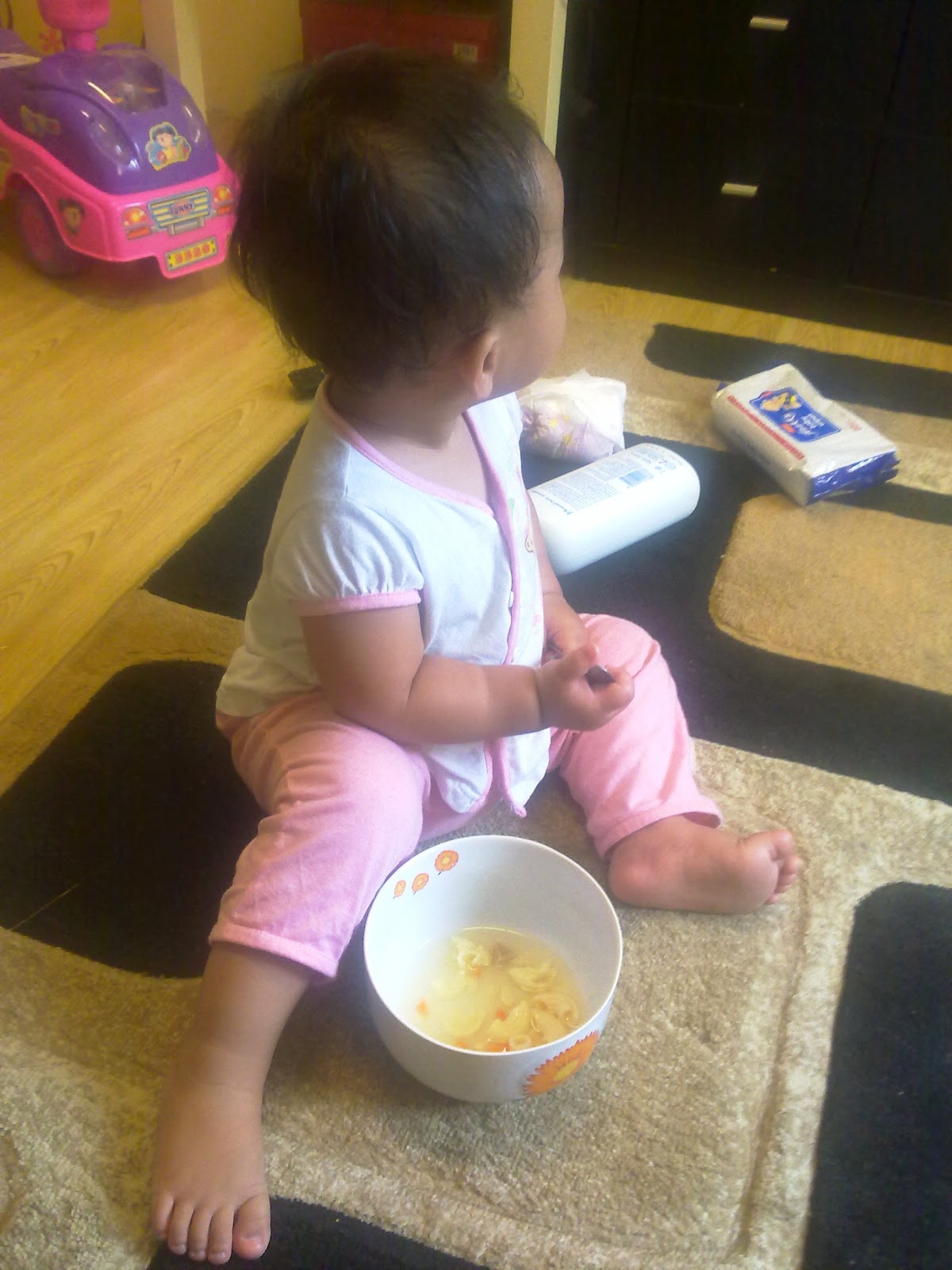 amani sejak dah besar ni pandai nak berdikari sendiri...makan pun taknak bersuap...semua nak buat sendiri...mule2 macam tak confident nak bagi die buat sendiri...tapi bile pikir2 balik, biar la...ni la time die nak belajar...biar la bersepah pun, nanti ibu kemas...makanan favourite die macaroni soup...kalau lain2 makan sikit je..badan pun dah susut...lagi2 kalau masak sayur bening letak suhun tu...memang selai2 die asingkan, pastu campak ke belakang sambil tepuk tangan...muke happy je lepas tu...tepuk dada la ibu...